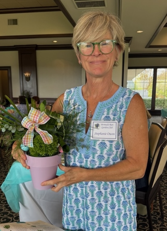 The Bermuda Run Garden Club welcomed a special guest this season as “Easter Bunny” Diane Guthrie led a fun, hands-on workshop focused on creating beautiful Easter centerpieces. Members learned how to transform greenery into unique designs, trimming large palm leaves into smaller pieces, rolling aspidistra leaves to resemble bunny ears, and braiding variegated lily grass to form decorative handles for their Easter pots.