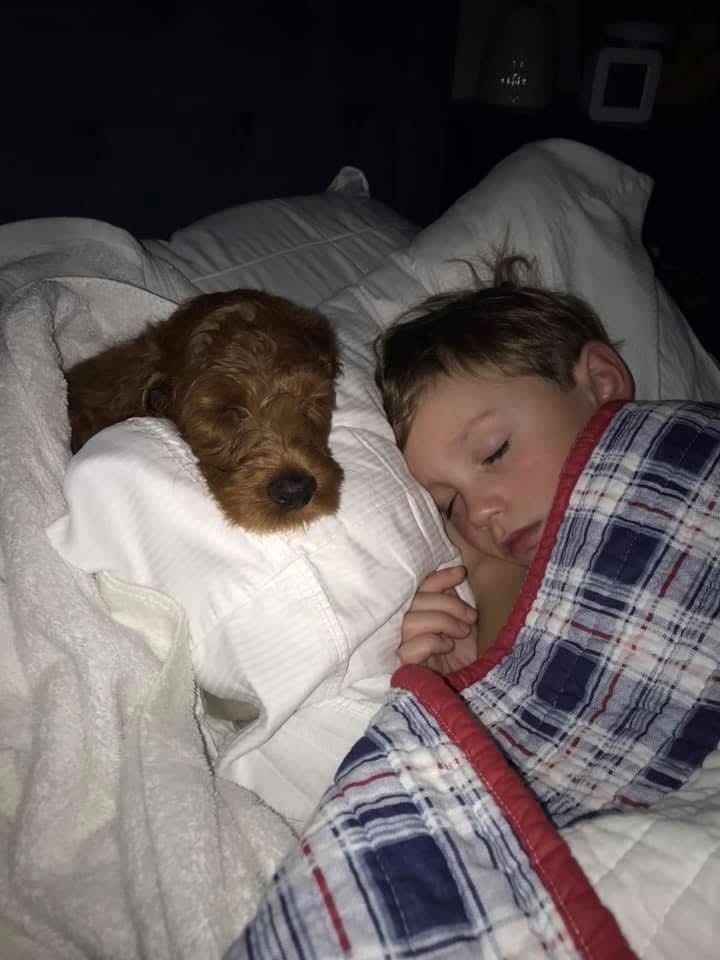 If she’s not patrolling the sidewalks for squirrels or playing in the backyard, the six-year-old red Goldendoodle is most likely curled up with her family (Danny, Jennifer, Hampton [8th grade], and Tucker [6th grade]) or chowing down on her favorite foods: yummy steak, delicious peanut butter, or tasty bagels (but don’t forget some delectable cream cheese on top!)