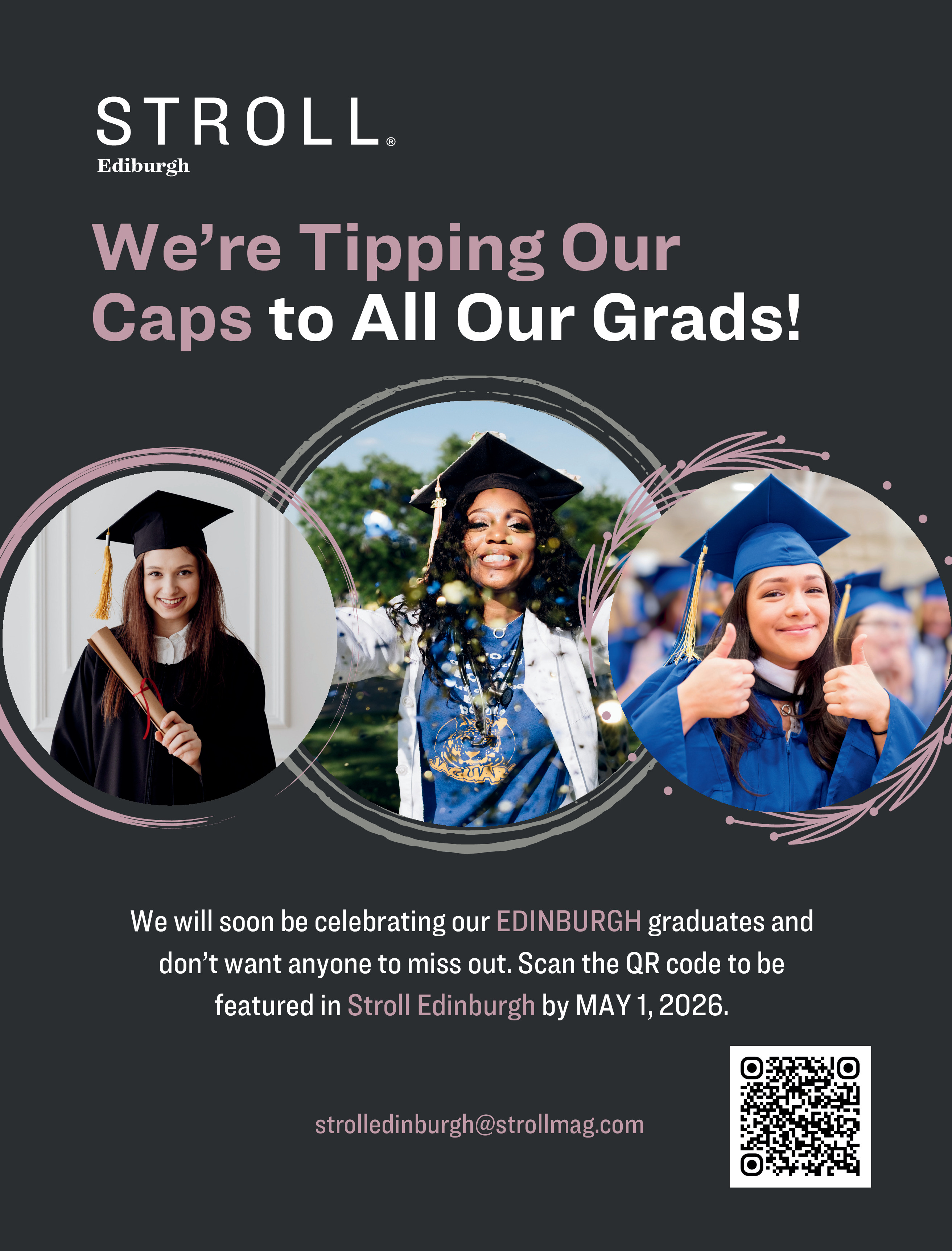 We are looking forward to celebrating the Class of 2026 inour June Edition of Stroll Edinburgh! Submit your information by May 1 to be included in this special Graduation Edition. https://forms.gle/u6ffKSiedAwtCPXb7