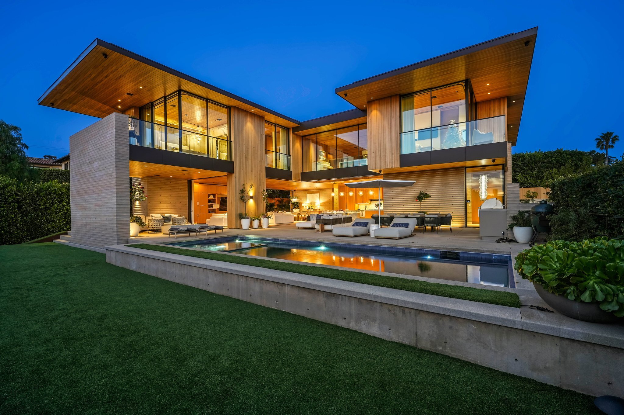 Editor’s note: After a laborious multi-year build, this 10,000 sq. ft. showstopper seamlessly fuses glass, cedar, and concrete into a triumphant architectural tour de force with a sense of permanence and grandeur. This magnificent home is considered one of the most impressive and high-quality contemporary estates ever built in Manhattan Beach, featuring panoramic ocean views from every room. Generously nestled on an extra-wide corner lot, this magnificent home boasts six bedrooms plus an additional office/nursery, nine bathrooms, home theater, game room, wine cellar, wet bar, and gym, with architecture by Laney LA.