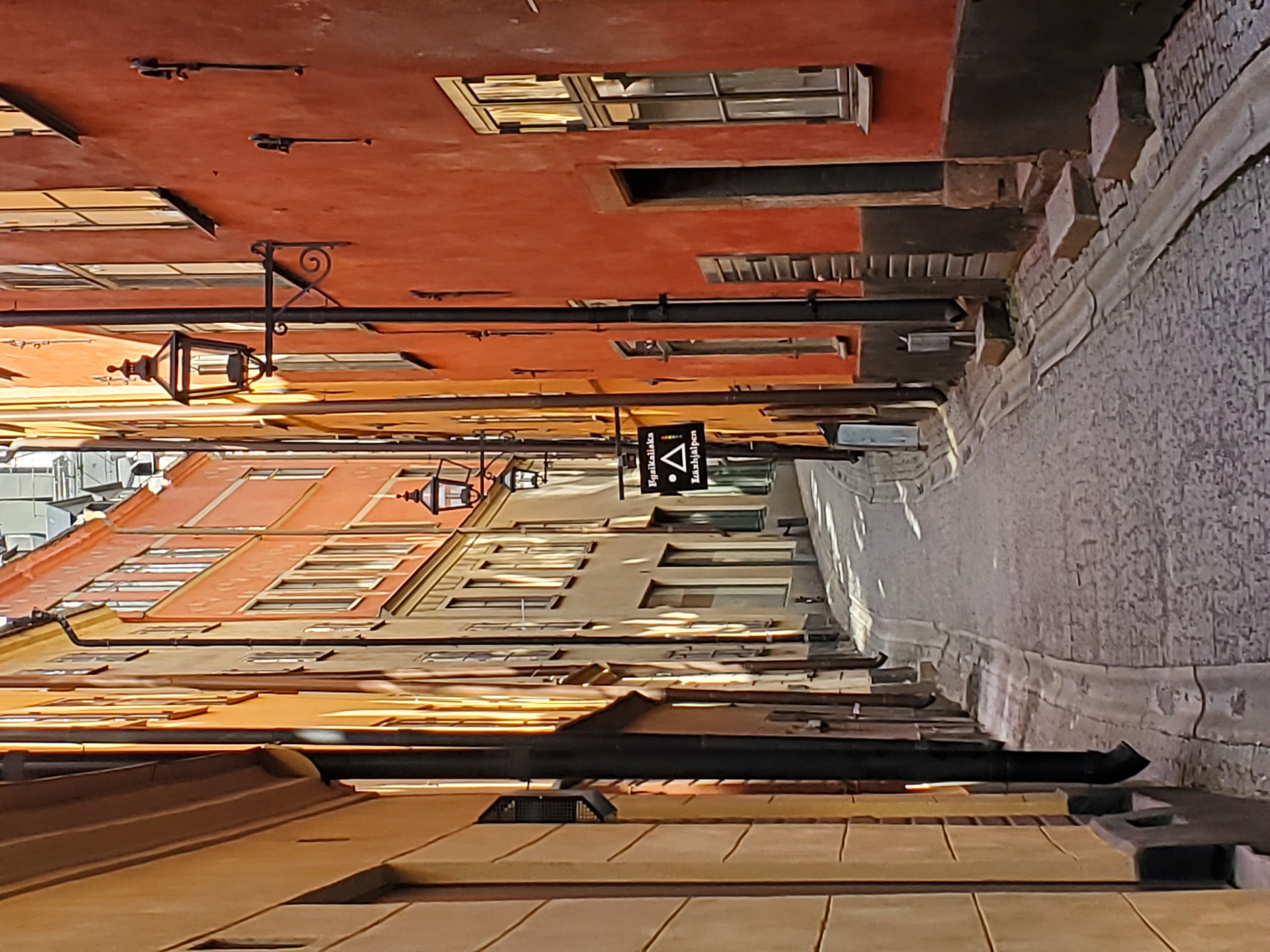 Upon exiting the church, I meandered down curvy, back streets ending at a busy square, Jarntorget , where people enjoyed outdoor dining. I passed the Nobel Prize Museum, walking all the way to the waterfront at Kornhammstorg, with many filled restaurants overlooking Lake Malaren. Here the Slussen Locks connect the salt water of the Baltic Sea and the fresh water of the huge lake. Upon returning I ventured past multiple colorful apartment buildings on narrow streets with the sun providing picturesque photos.